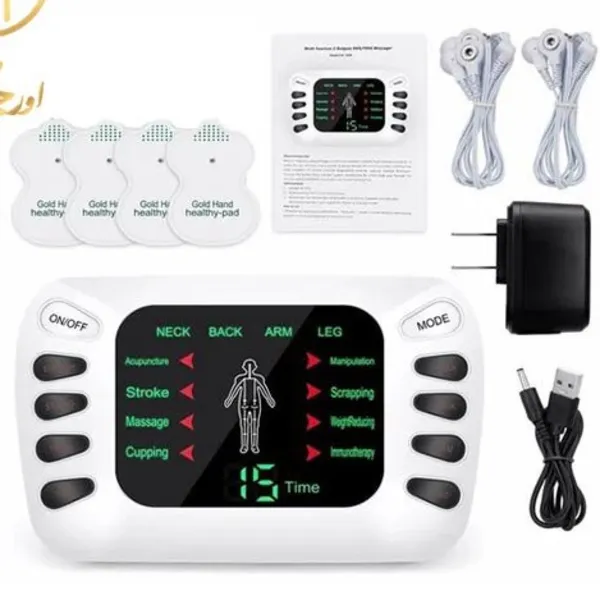 - نحوه استفاده: دوشاخه سیم الکترود را در جک الکترود واحد قرار دهید. برچسپ را از روی پدهای الکترود جدا کنید. از یک حوله مرطوب برای پاک کردن قسمتی از پوست که قرار است پدها را روی آن بچسبانید، استفاده کنید تا هرگونه روغن، مواد آرایشی یا کثیفی پاک شود. در صورت کثیف شدن پدهای الکترود، هم چسبندگی و هم تعداد دفعات استفاده ممکن کاهش می یابد. پدهای الکترود را روی ناحیه ای از بدن که می خواهید ماساژ دهید، بمالید. واحد نمی تواند کار کند مگر اینکه هر دو پد از حداقل یک تغییر اعمال شوند. توضیحات دکمه: مجموعا 14 دکمه 1. دکمه “شانه”: لباس برای ماساژ روی شانه و پشت. دکمه سرعت “+”/”-” را برای تنظیم شدت فشار دهید. و سرعت به طور خودکار کاهش یا افزایش می یابد. 30 دقیقه طول می کشد تا یک درمان کامل کامل شود. حالت انتقال در هر 5 دقیقه (PRESS->RUB->VIBRATE->THUMP). 2. دکمه “کمر”: طراحی شده برای ماساژ کمر. وضعیت ماساژ کمر روی صفحه نمایش داده می شود. و حالت را در هر 5 دقیقه تغییر دهید (PRESS->RUB->VIBRATE->THUMP)، دکمه سرعت “+”/”-” را فشار دهید 3. دکمه “مفاصل”: برای ماساژ مفاصل طراحی شده است. تغییر حالت در هر 5 دقیقه (PRESS->RUB->VIBRATE->THUMP)، دکمه سرعت “+”/”-” را برای تنظیم شدت فشار دهید. 4. دکمه “Hand&Foot” مناسب برای ماساژور دست و پا. حالت ماساژ دست و پا در هر 5 دقیقه قابل تغییر است. در مجموع 4 حالت (PRESS->RUB->VIBRATE->THUMP). 5. دکمه “پا”: تنظیم به ماساژ پا، تغییر حالت ماساژ هر 5 دقیقه دکمه سرعت “+”/ “-” را برای تنظیم شدت فشار دهید. و سرعت به طور خودکار کاهش یا افزایش می یابد. 6. دکمه تکرار: فقط در حالت بالای 5 حالت مفید است این دکمه را فشار دهید تا بالای 5 عملکرد ماساژ مختلف تکرار شود7. زمان ماساژ نمایش داده شده بر روی صفحه نمایش 8. سرعت ماساژ روی صفحه نمایش داده می شود 9. سرعت و شدت: هر دو شامل دکمه های بالا (+) و کم (-) هستند. دکمه high را برای افزایش نمره، دکمه Low را برای کاهش نمره فشار دهید. 10. دکمه “Thump”: آن را فشار دهید تا ماساژ ضربان شروع شود. 11. دکمه “لرزش”: آن را فشار دهید تا ماساژ ویبره شروع شود. 12. دکمه “مالش”: آن را فشار دهید تا شروع به ماساژ دادن شود. 13. دکمه “پرس”: آن را فشار دهید تا ماساژ را فشار دهید. 14. ON/OFF: دکمه را روشن کنید تا دستگاه راه اندازی شود، خاموش شود تا کار متوقف شود. 8 درجه برای شدت الکترونیکی وجود دارد.
