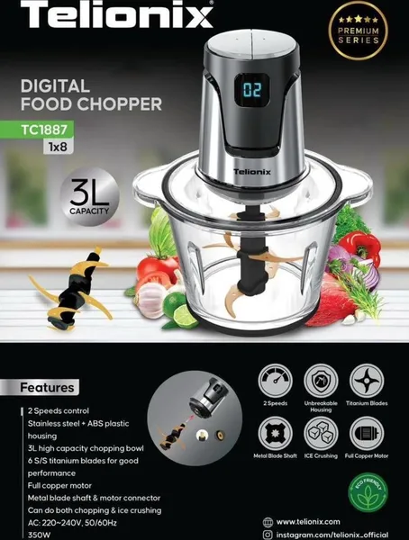 خردکن تلیونیکس مدل 1887 یک دستگاه حرفهای با کاسه شیشهای مقاوم 3 لیتری و تیغه تیتانیومی 6 پره است که برای خرد کردن مواد سخت، مخلوط کردن و آسیاب انواع مواد غذایی طراحی شده است.