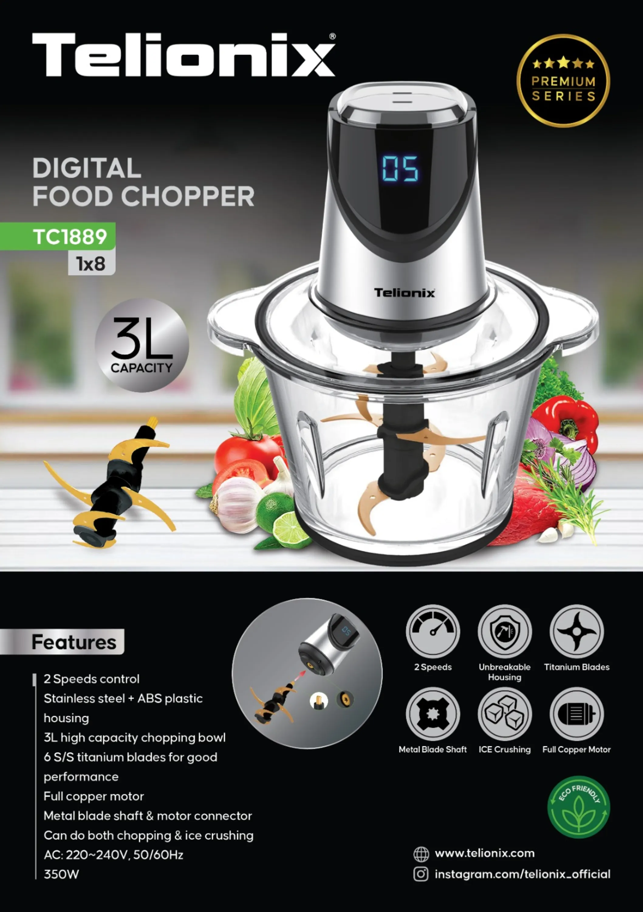 خردکن تلیونیکس مدل 1889 یک دستگاه حرفهای با کاسه شیشهای مقاوم 3 لیتری و تیغه تیتانیومی 6 پره است که برای خرد کردن مواد سخت، مخلوط کردن و آسیاب انواع مواد غذایی طراحی شده است.